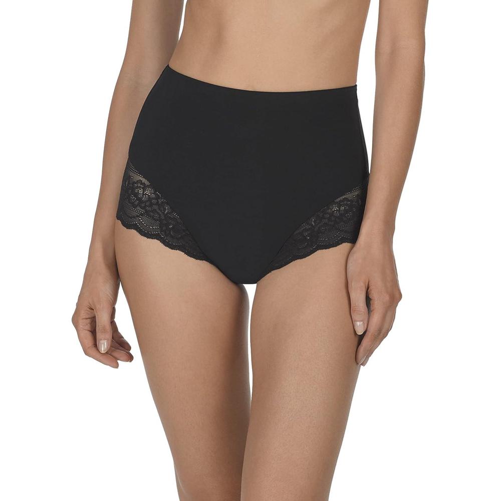 Shape wear High rise thong flattens and smooth's the tummy with contouring high power stretch jersey fabric. Sexy skin soft lace at leg for comfort that doesn't dig-in.